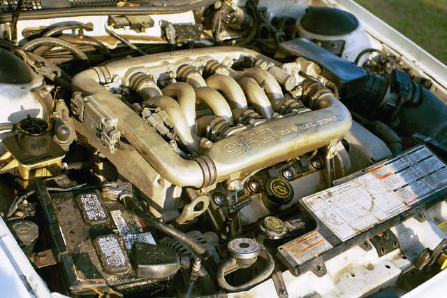 Not the cleanest engine bay. What you cant see is the oil in the plug wells, the who-knows how old rear plugs, the unhooked secondarys, and the bad CID. |
